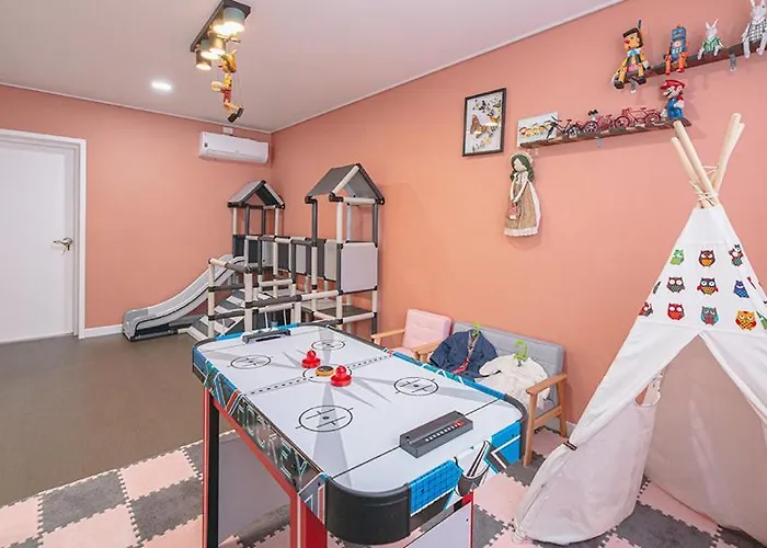 Situated 3.8 km from Geumneung Stone Park, the 2-bedroom Wildlucent Private Poolvilla Jeju villa invites guests to relax at a terrace. The availability of a Jacuzzi and a sauna ensures a relaxing getaway in the Hangyeong district of Jeju.